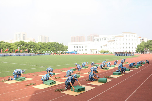 45个方阵踏着嘹亮的军歌,步伐整齐接受检阅。匕首操、刺杀操、学生叠被、男子擒敌拳四项汇报表演展示了我校2017级学生昂扬向上的精神风貌。